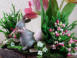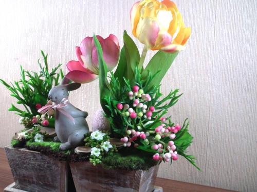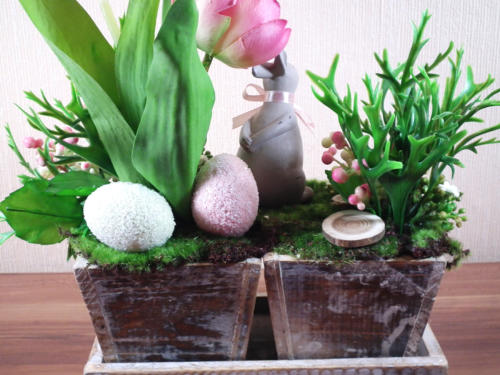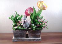 Der kecke graue Hase im Antik-Look hat sich schon mal zwei zart-beperlte Ostereier gesichert und wartet im Garten gespannt auf das Osterfest - alles in zarten pastelligen Frühlingsfarben. Die beiden Holztröge sind auf dem Tablett fixiert.Verwendetes Material:Seidenblumen, künstliche Materialien, Holzgefäß, Hase aus Polyresin usw.